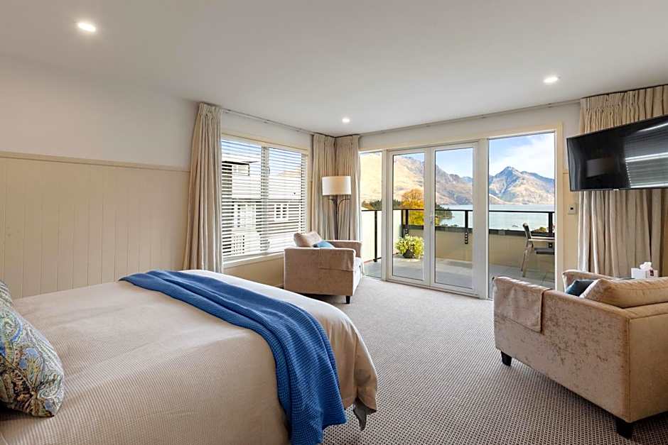 This room has large glass doors opening onto a private furnished patio or balcony to take in the spectacular mountain and lake views. This room gives you extra space with seating inside and out. The ensuite provides you with a bath and shower. This room has a large comfortable bed, en suite, separate baggage area and an area to hang your clothes. It offers WiFi, TV, tea and coffee making facilities, fridge/freezer. This room includes a delicious breakfast and evening canapé hour daily.